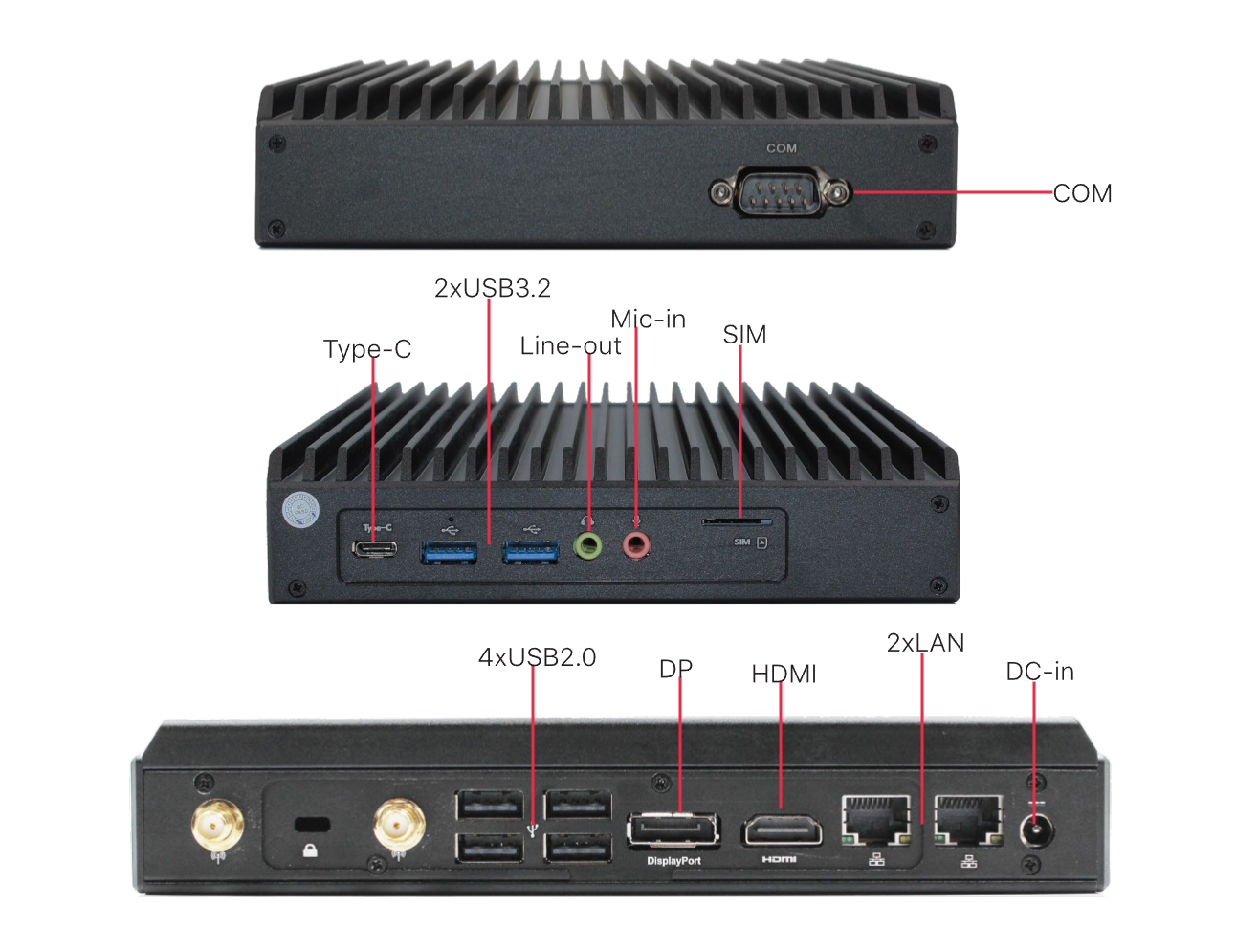 双显示与丰富接口:支持通过HDMI和DP双独立显示,提供出色的视觉体验;配备多种I/O接口,包括2xLAN、1xCOM、Type-C、2xUSB3.2和4xUSB2.0,满足各种设备连接需求。