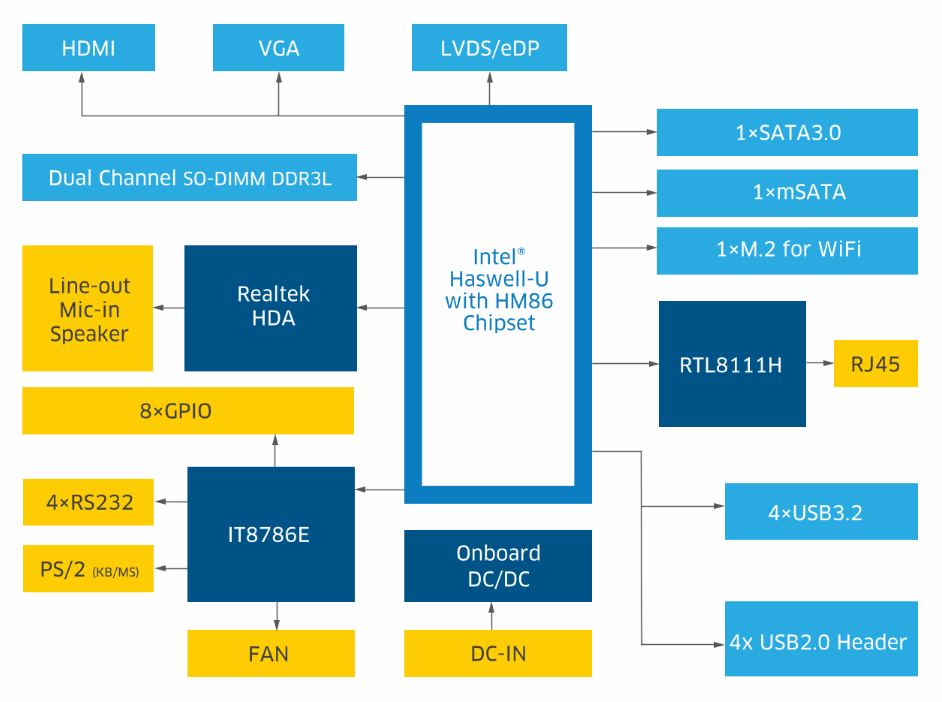 Display: Multiple display via HDMI, VGA, LVDS/eDP
